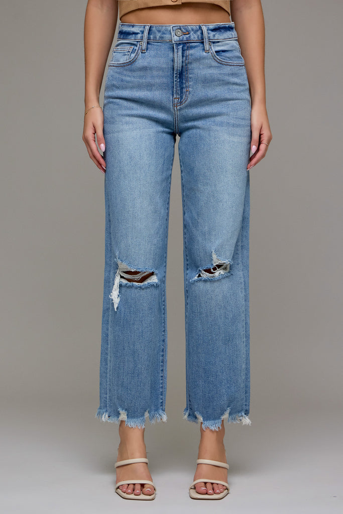 [ELLA] Medium Light 28" Inseam Distressed Stretch Wide Straight