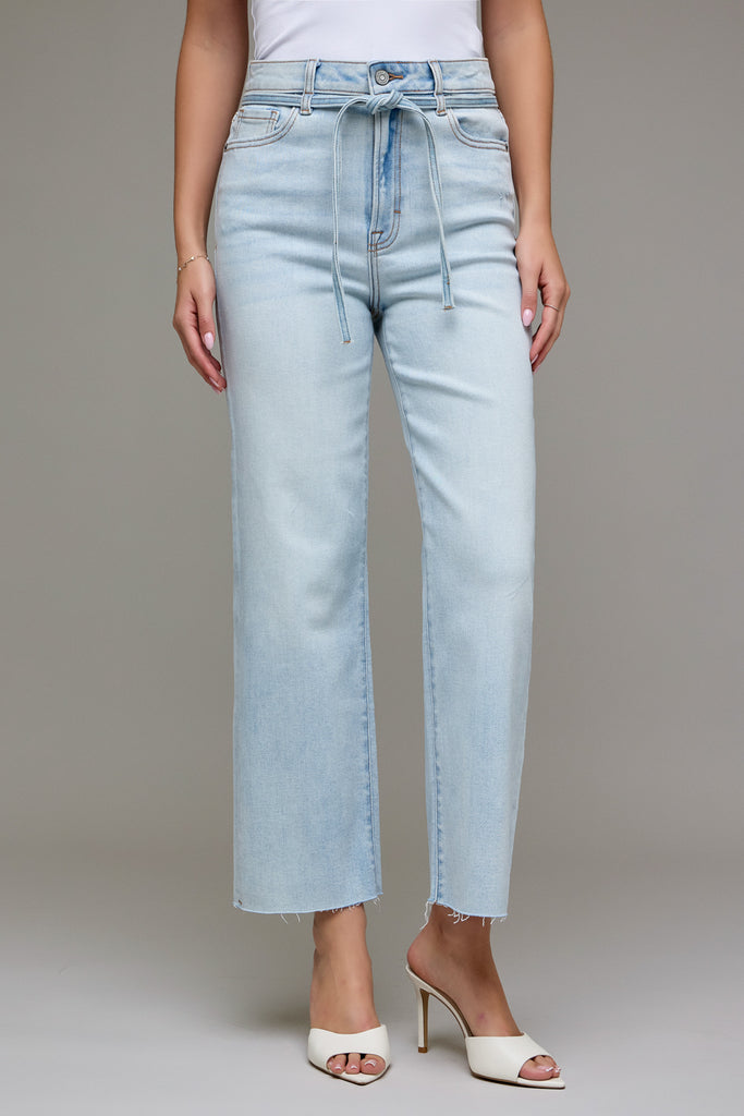 [ELLA] Light Wash Tie Waist Clean Stretch Wide Straight