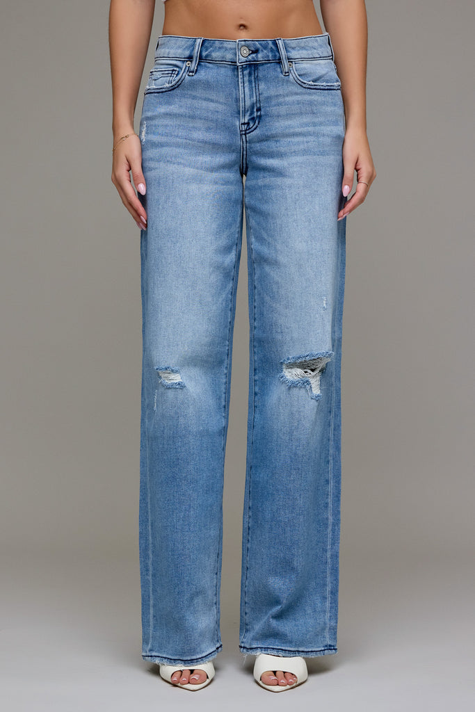 [Logan] Medium Wash Mid Rise Distressed 33" Inseam Dad Jean
